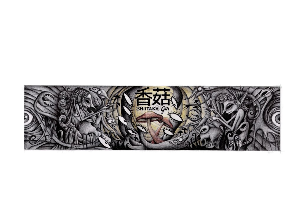 L’etichetta di Shiitake Gin è un’opera d’arte a sé, un affresco contemporaneo che traduce in immagini la magia del bosco.